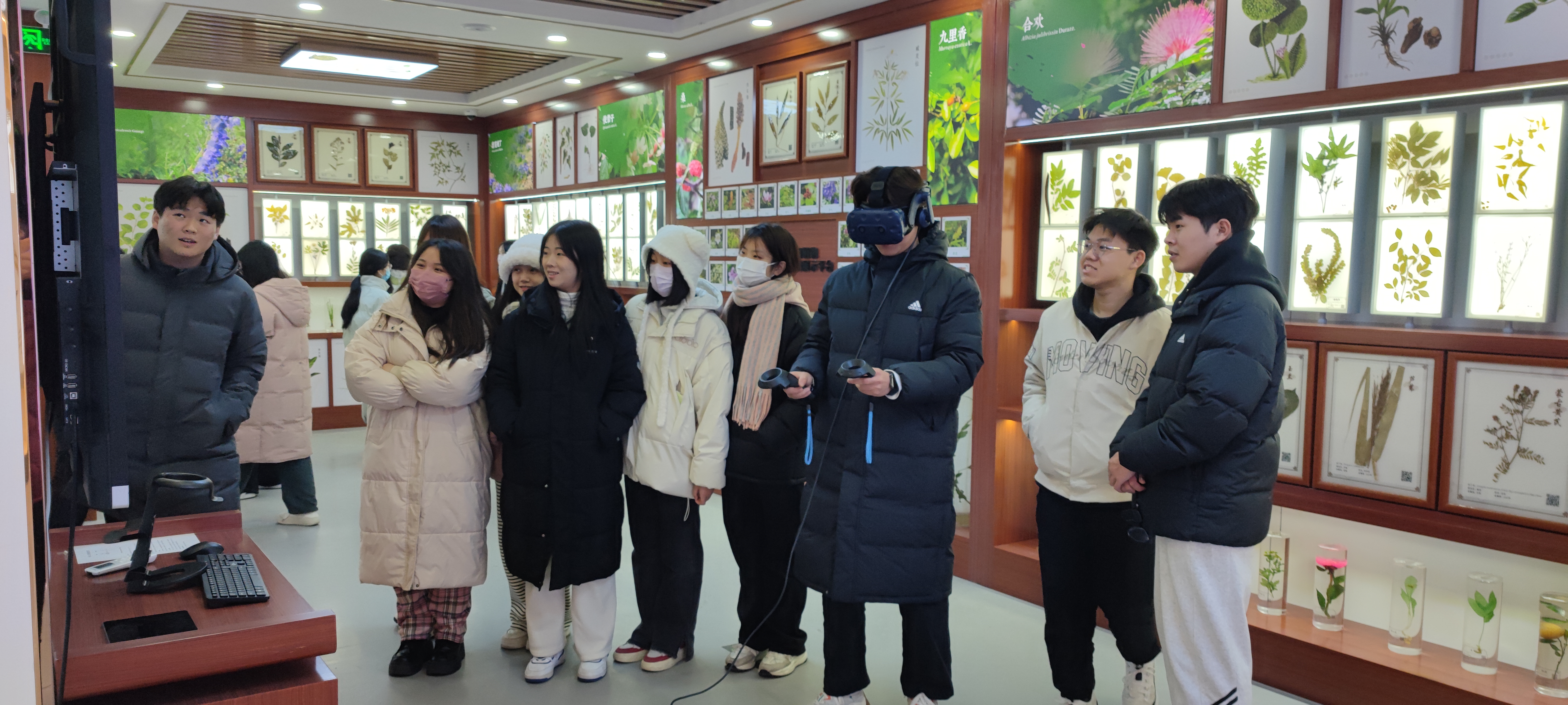 讲解员首先介绍了中药科技馆的布局,随后带领同学们在各功能厅参观、体验。在大别山特色厅,讲解员结合投影互动沙盘和360°全息技术展示了大别山的特色药材,使同学们了解到大别山道地药材的各期生长形态。在浸制、腊叶标本厅,讲解员鼓励同学们在VR和AR区体验河南道地药材的采集过程。