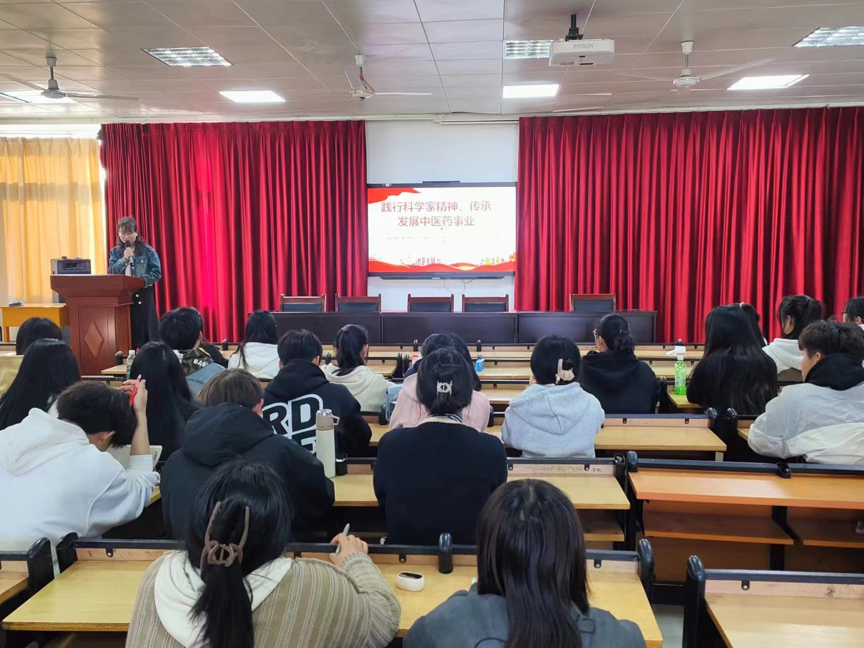 随后,她重点讲解了中医药事业的发展历程、现状以及未来前景。强调了中医药在保障人民健康、促进经济发展等方面的重要作用,并鼓励学生们积极参与到中医药的传承与创新中来。在互动环节中,学生们就如何践行科学家精神、推动中医药事业发展等问题展开了热烈讨论,现场气氛热烈,同学们发言踊跃、各抒己见,结合学习、生活实际谈感受。